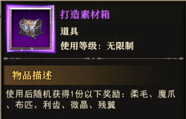 使用后随机获得1份以下奖励:柔毛、魔爪、布匹、利齿、微晶、残翼。